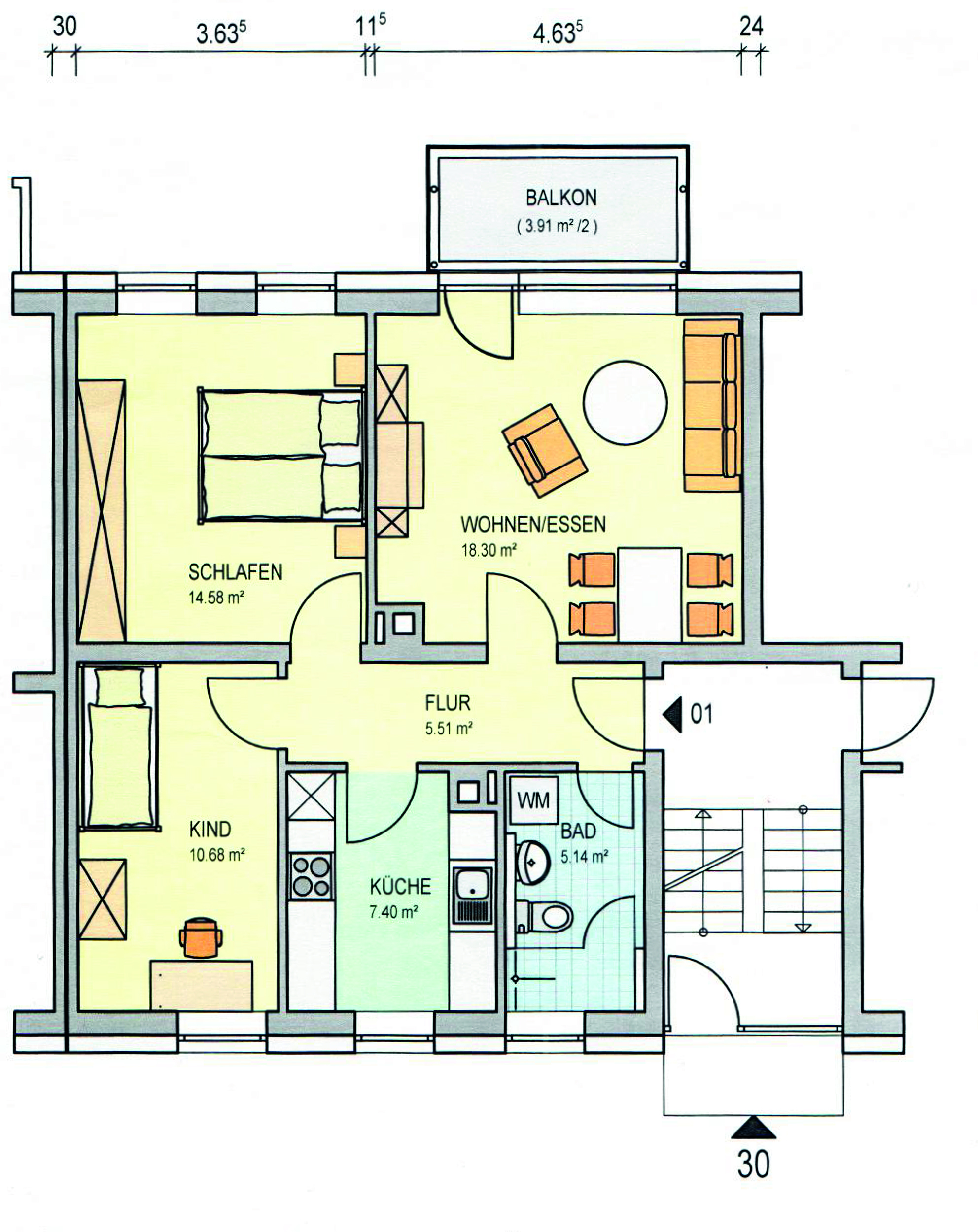Die Planerstellung erfolgt dann auf Grundlage von gültigen, vermaßten Bestandsplänen. Dabei werden fehlende Türanschläge sowie fehlende Möblierung in Küche und Bad ergänzt. Die Wohnflächen werden anhand der vorhandenen Rohbaumaße ermittelt.